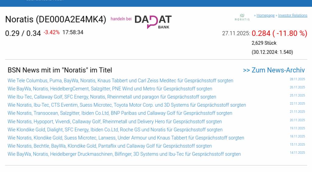 Noratis am 27.11. -11,80%, Volumen 44% normaler Tage
