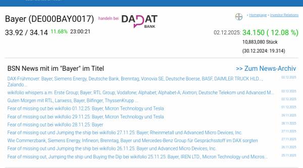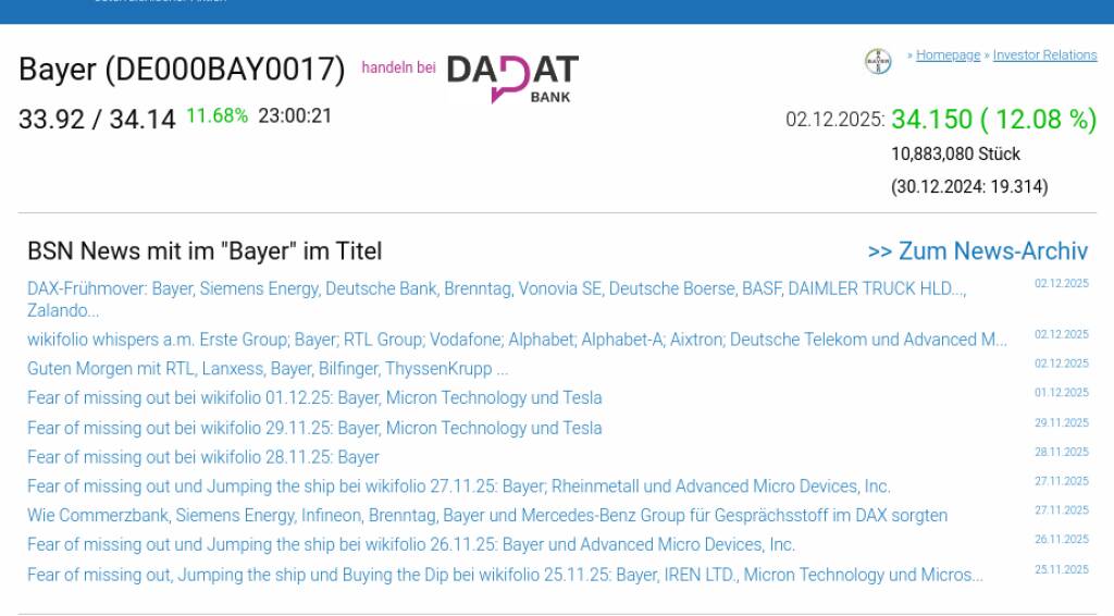 Bayer am 2.12. 12,08%, Volumen 323% normaler Tage