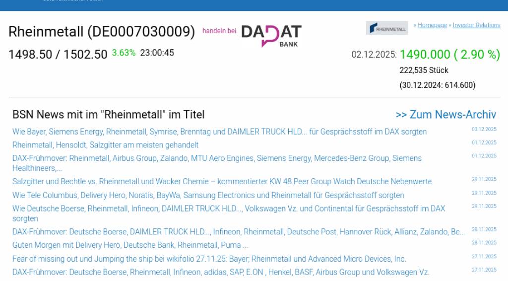 Rheinmetall am 2.12. 2,90%, Volumen 66% normaler Tage