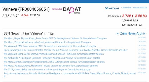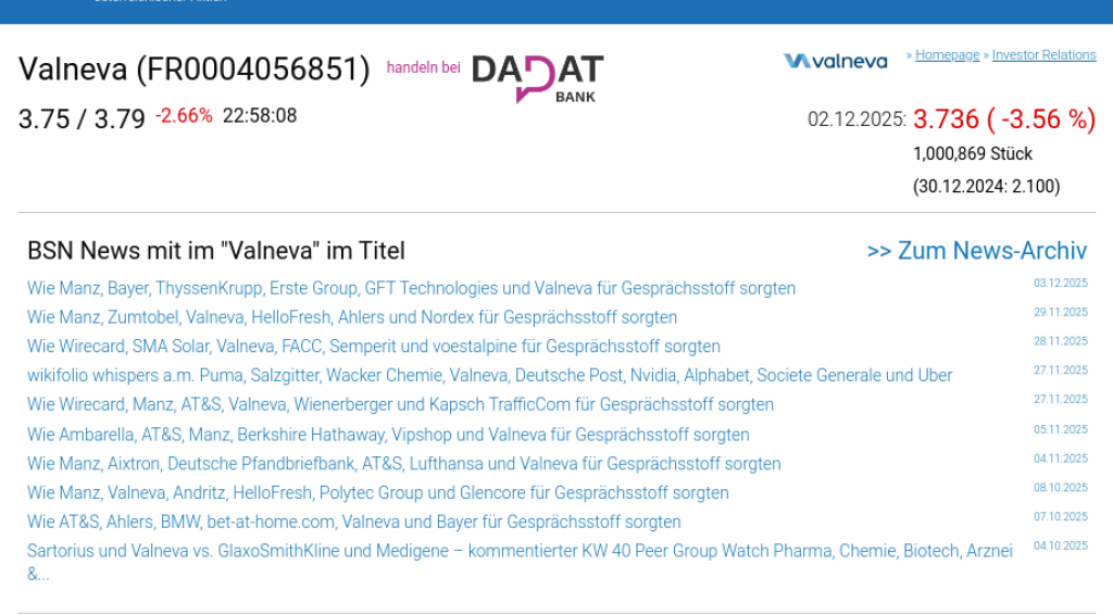 Valneva am 2.12. -3,56%, Volumen 75% normaler Tage