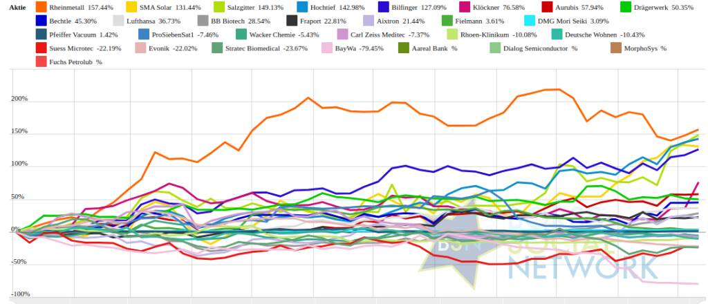 Year-to-date lag per letztem Schlusskurs Rheinmetall 157,89% (Vorjahr: 114,15 Prozent) im Plus. Dahinter SMA Solar 154,42% (Vorjahr: -77,61 Prozent) und Salzgitter 149,62% (Vorjahr: -43,43 Prozent). BayWa -76,84% (Vorjahr: -66,07 Prozent) im Minus. Dahinter Stratec Biomedical -23,83% (Vorjahr: -34,58 Prozent) und Evonik -22,95% (Vorjahr: -9,57 Prozent).