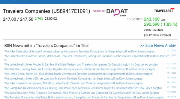 Travelers Companies am 15.12. 1,85%, Volumen 158% normaler Tage