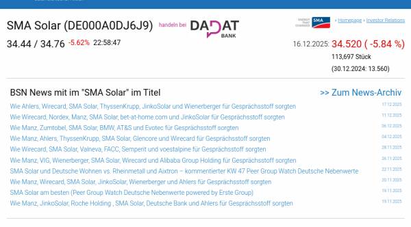 SMA Solar am 16.12. -5,84%, Volumen 52% normaler Tage