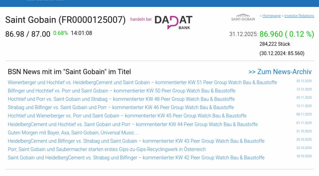 Saint Gobain am 31.12. 0,12%, Volumen 100% normaler Tage