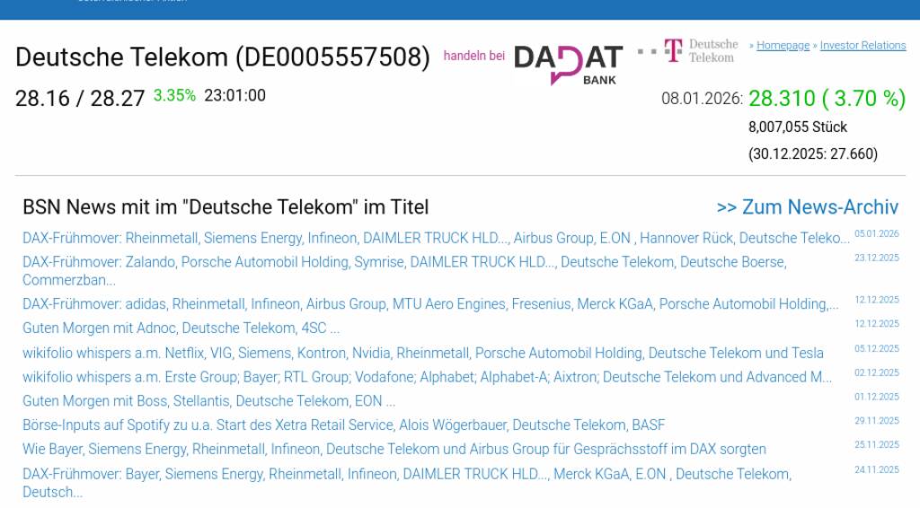 Deutsche Telekom am 8.1. 3,70%, Volumen 130% normaler Tage