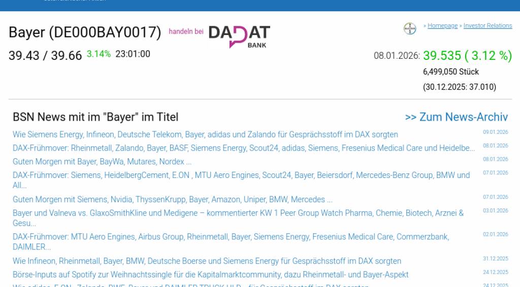 Bayer am 8.1. 3,12%, Volumen 145% normaler Tage