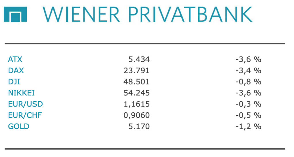 Aus den Morning News der Wiener Privatbank: "Die Wiener Börse hat gestern Dienstag mit herben Verlusten geschlossen. Die Ängste vor einer Eskalation des Iran-Konflikts und den wirtschaftlichen Folgen zogen die Börsen europaweit nach unten. Der österreichische Aktienindex ATX beendete den Tag mit einem Minus von 3,55 Prozent und 5.433,81 Punkten. Andere Börsenindizes in Europa verloren ähnlich stark. An den Börsen geht wegen des amerikanisch-israelischen Kriegs gegen den Iran weiter die Sorge vor einer Energiekrise um. Der Fokus der Kapitalmärkte liegt aktuell auf dem Risiko einer Eskalation sowie der sicheren Versorgung mit Energie, insbesondere durch die Straße von Hormuz. Die damit steigenden Öl- und Erdgaspreise nähren zudem Konjunktur- und Inflationsängste. Entscheidend für die Marktstimmung ist, wie sehr sich der Konflikt ausweitet, wie lange er dauert, wie die übrigen Großmächte auf den Angriff reagieren und wie stark die Energiepreise steigen.