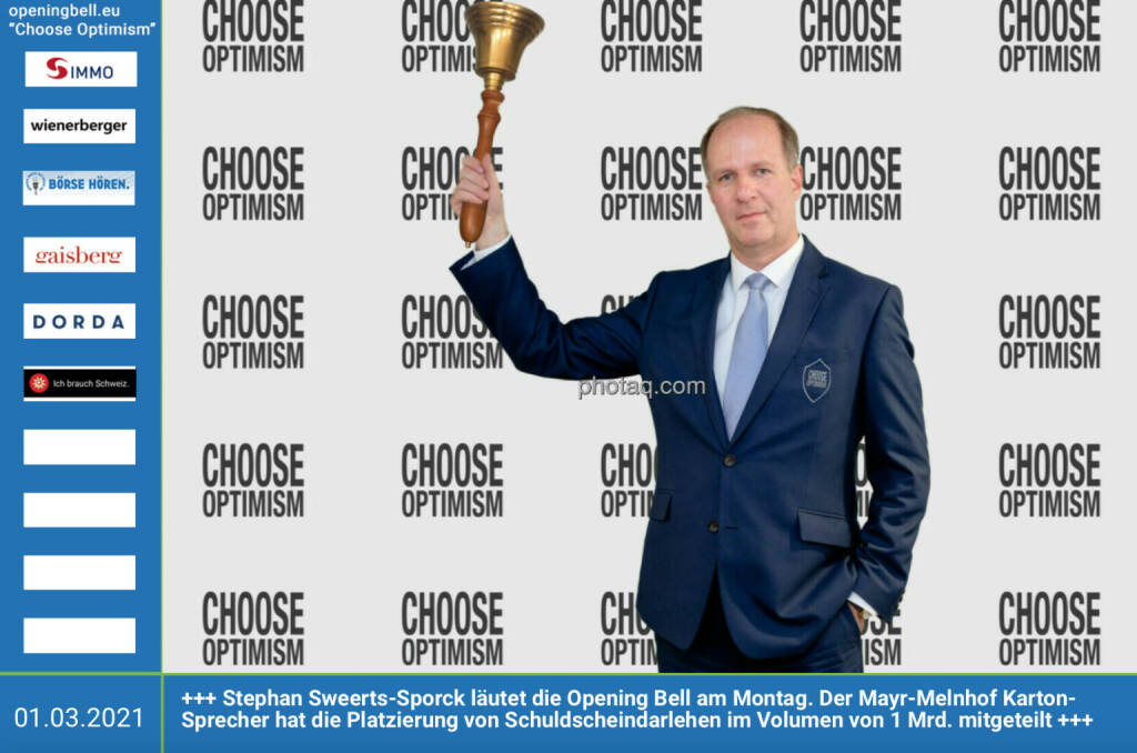 1.3.: Stephan Sweerts-Sporck läutet die Opening Bell am Montag. Der Mayr-Melnhof Karton-Sprecher hat die Platzierung von Schuldscheindarlehen im Volumen von 1 Mrd. mitgeteilt. Choose Optimism: https://boerse-social.com/category/choose_optimism https://www.facebook.com/chooseoptimism/