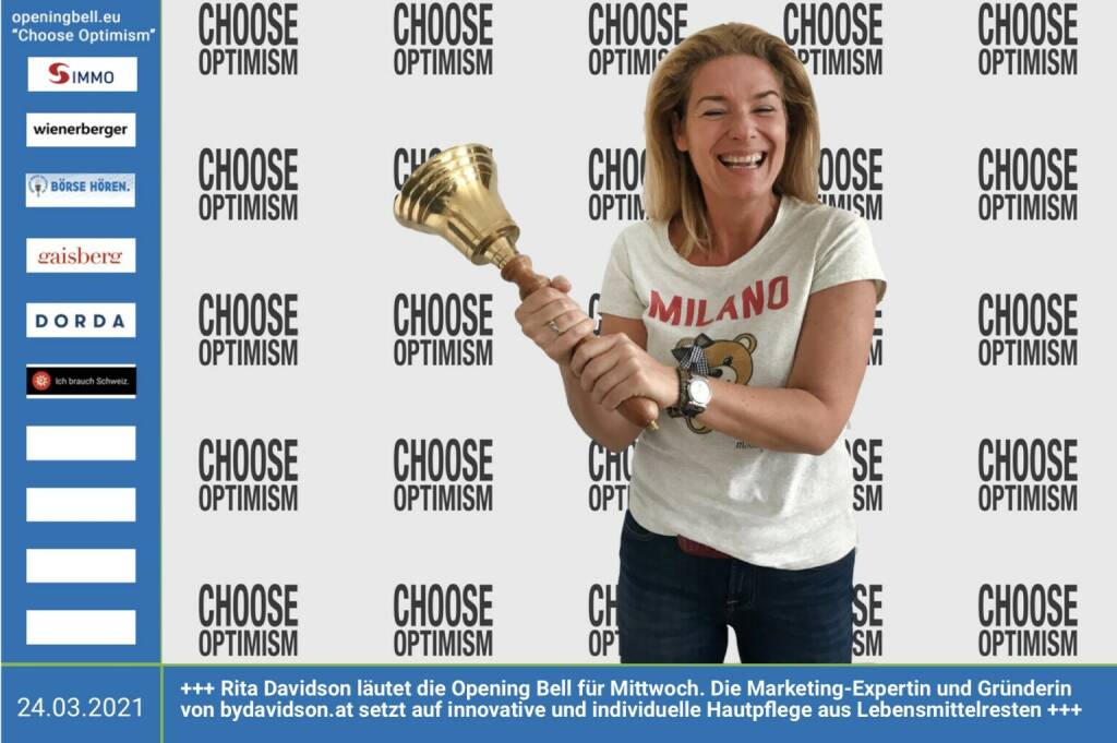 24.3.: Rita Davidson läutet die Opening Bell für Mittwoch. Die Marketing-Expertin und Gründerin von bydavidson.at setzt auf innovative und individuelle Hautpflege aus Lebensmittelresten https://www.bydavidson.at Choose Optimism: https://boerse-social.com/category/choose_optimism https://www.facebook.com/chooseoptimism/