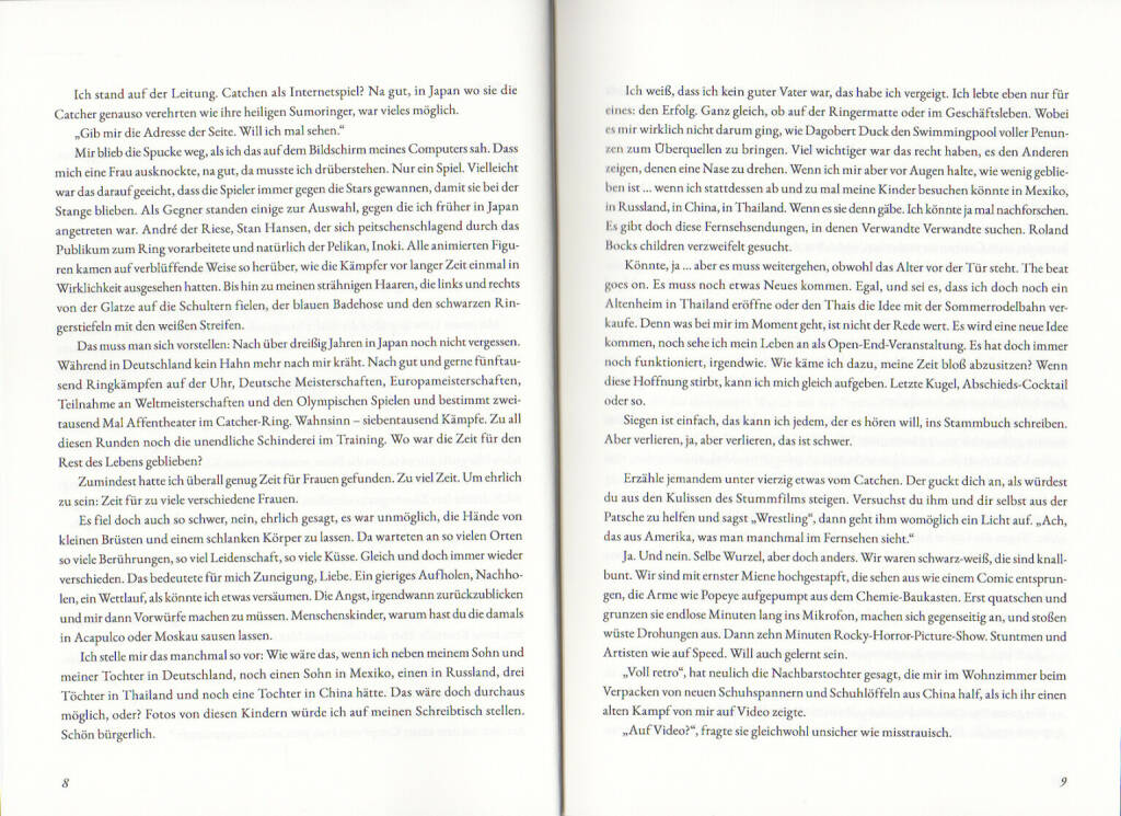 Eine unglaubliche, prall gefüllte Roman-Biographie, die für mehrere Leben reicht. Misshandlungen in der Kindheit im Nachkriegs-Deutschland. Olympia, Catcher-Karriere, im Kampf gegen Bär und Stier, vor der Film-Kamera neben Gerard Depardieu, abenteuerliche Geschäftsideen, hinter Gittern, die vergebliche Suche nach der richtigen Frau, Leben im Paradies und die brutale Landung in der Vergangenheit. Von Verzweiflung und Hoffnung und Höhenflug. Vom Irrsinn zum Wahnsinn. Da hat die heile Welt nicht immer Platz.