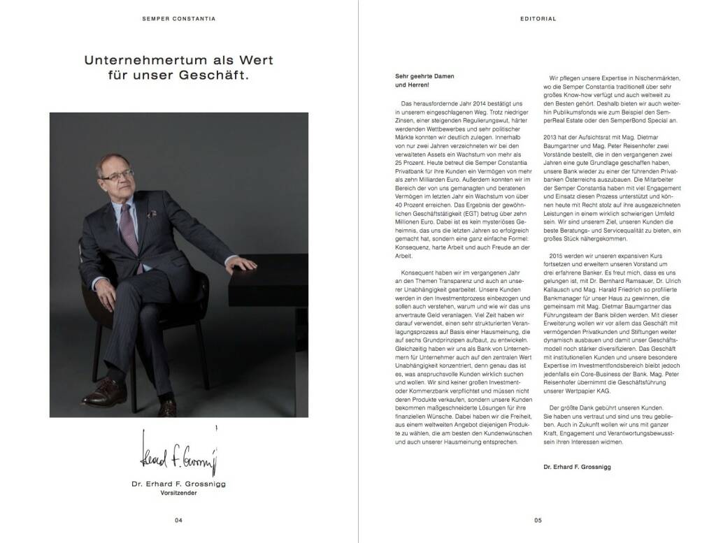 Sample page 2 for "Semper Constantia Geschäftsbericht 2014 - Dr. Erhard F. Grossnigg Vorsitzender"