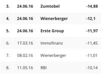 Gestoppte bzw. gedrehte Serien: Uniqa -8,26% auf 5,55, davor 5 Tage im Plus (9,25% Zuwachs von 5,54 auf 6,05), Immofinanz -6,99% auf 1,97, davor 5 Tage im Plus (7,73% Zuwachs von 1,97 auf 2,12), Erste Group -11,97% auf 19,895, davor 5 Tage im Plus (7,82% Zuwachs von 20,96 auf 22,6), VIG -7,38% auf 17,32, davor 5 Tage im Plus (11,34% Zuwachs von 16,8 auf 18,7), SBO +0,29% auf 52,51, davor 4 Tage im Minus (-2,93% Verlust von 53,94 auf 52,36).