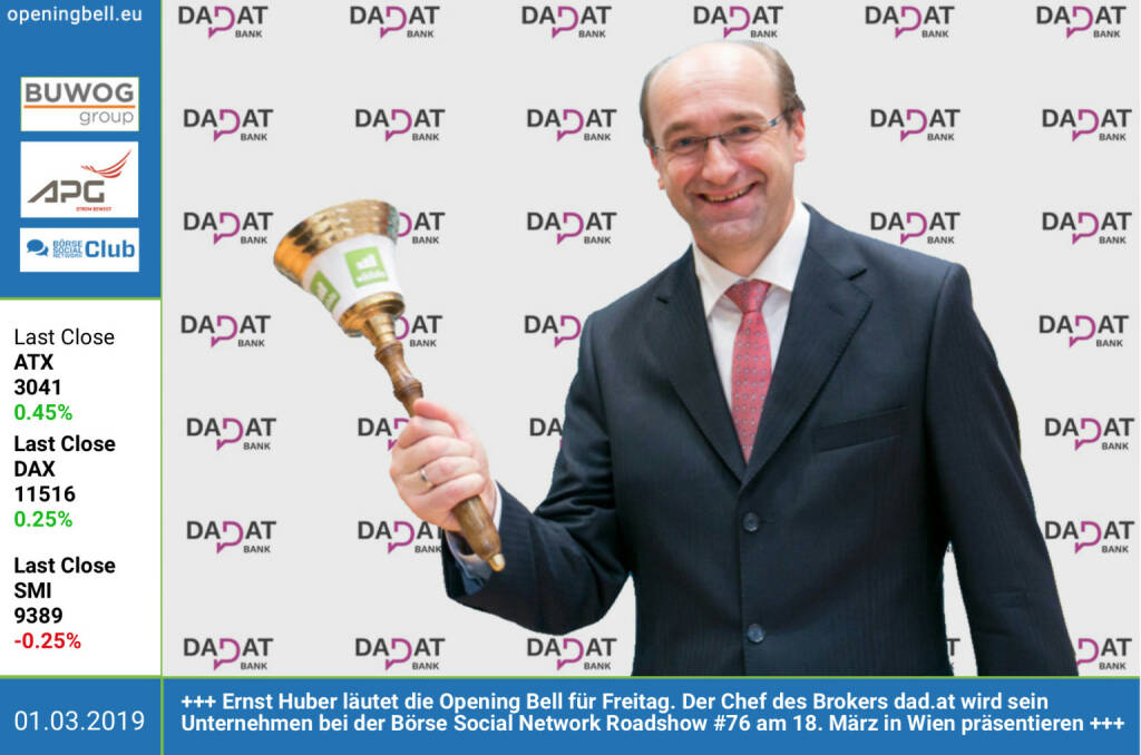 1.3.: Ernst Huber läutet die Opening Bell für Freitag. Der Chef des Brokers dad.at wird sein Unternehmen bei der Börse Social Network Roadshow #76 am 18. März in Wien präsentieren http://www.dad.at https://www.facebook.com/groups/GeldanlageNetwork