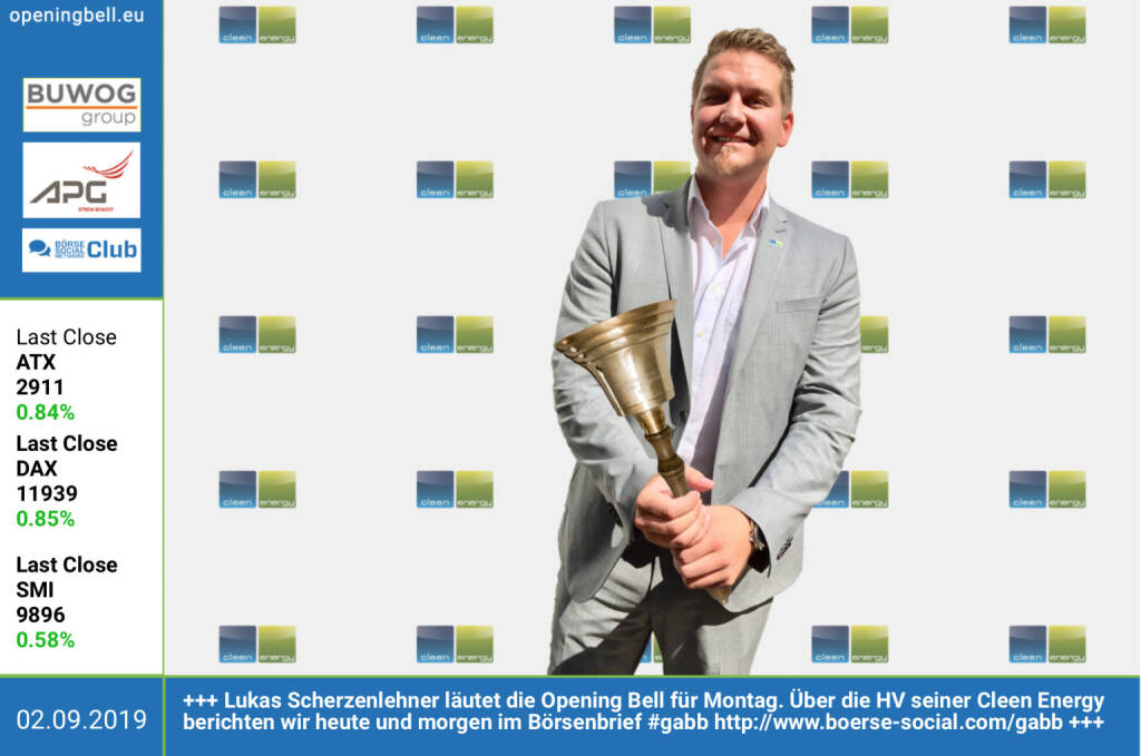 26.2.: Lukas Scherzenlehner läutet die Opening Bell für Dienstag. Am 18.März gibt er bei der Börse Social Network Roadshow #76 in Wien ein Update zu seiner seit 2017 gelisteten Cleen Energy http://www.cleen-energy.com https://www.facebook.com/groups/GeldanlageNetwork