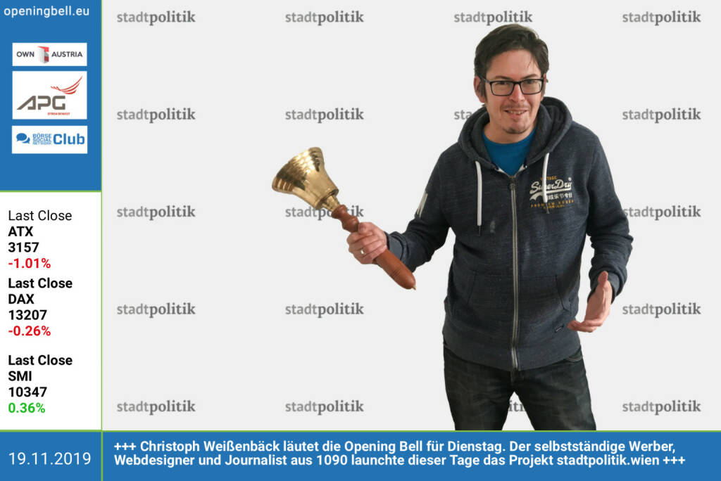 19.11.: Christoph Weißenbäck läutet die Opening Bell für Dienstag. Der selbstständige Werber, Webdesigner und Journalist aus 1090 launchte dieser Tage das Projekt http://www.stadtpolitik.wien