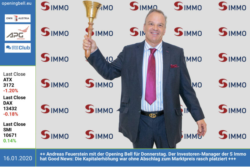 16.1.: Andreas Feuerstein läutet die Opening Bell für Donnerstag. Der Investoren-Manager der S Immo hat Good News: Die Kapitalerhöhung war ohne Abschlag zum Marktpreis rasch platziert https://www.simmoag.at