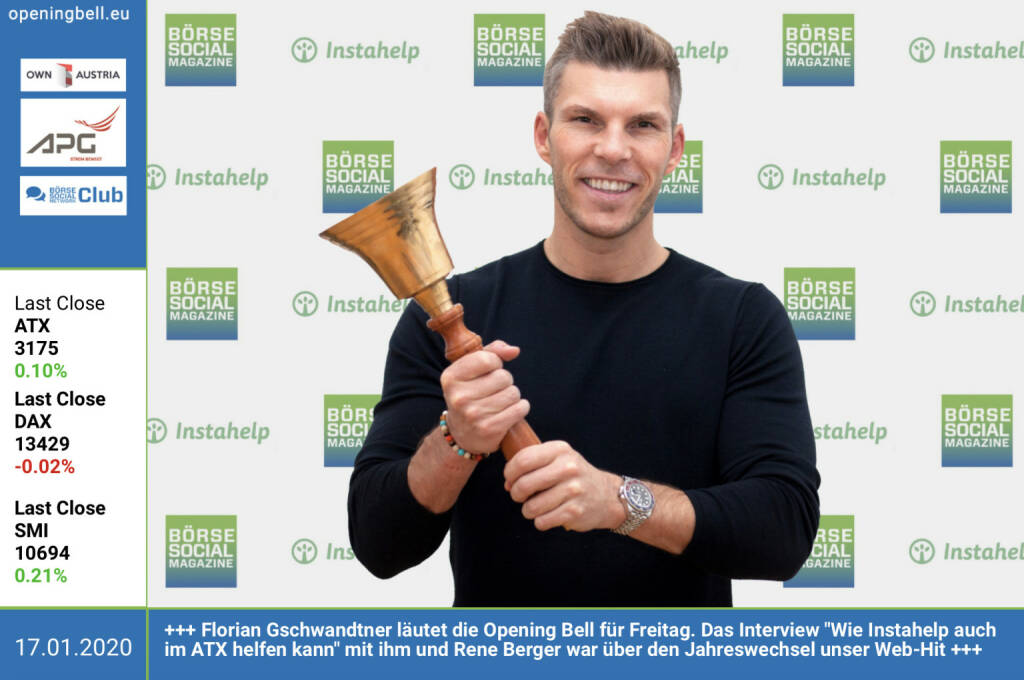 17.1.: Florian Gschwandtner läutet die Opening Bell für Freitag. Das Interview "Wie Instahelp auch im ATX helfen kann" mit ihm und Rene Berger war über den Jahreswechsel unser Web-Hit https://boerse-social.com/2019/12/26/instahelp_das_start...
