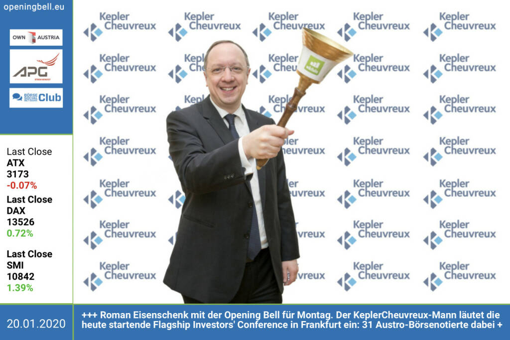 20.1.: Roman Eisenschenk mit der Opening Bell für Montag. Der KeplerCheuvreux-Mann läutet die heute startende Flagship Investors' Conference in Frankfurt ein: 31 Austro-Börsenotierte dabei https://www.german-corporate-conference.com/companies/