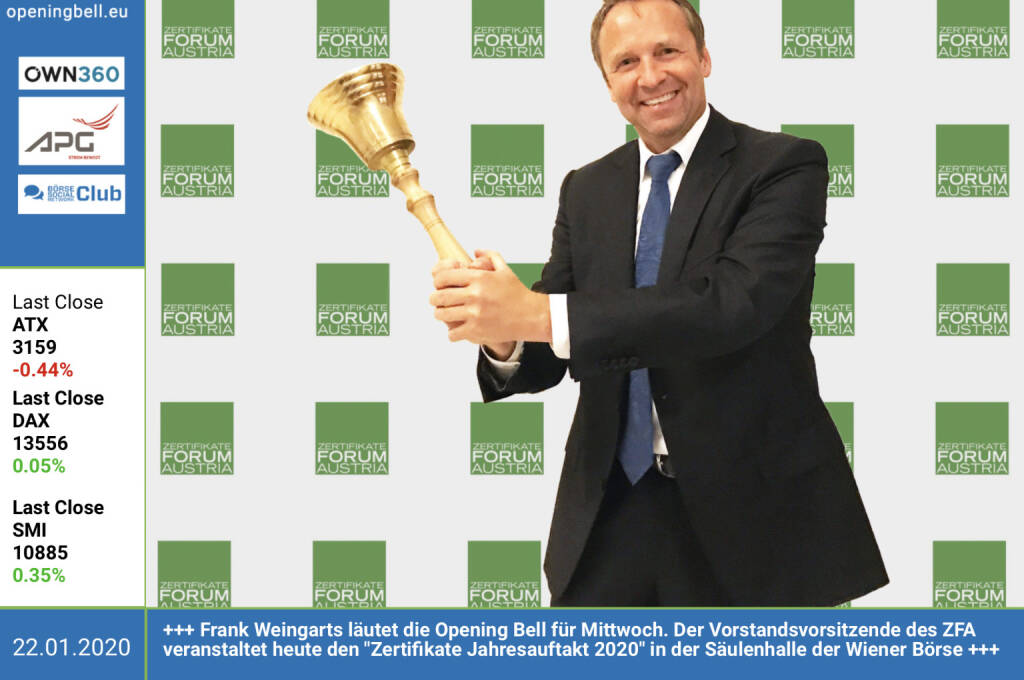 22.1.: Frank Weingarts läutet die Opening Bell für Mittwoch. Der Vorstandsvorsitzende des ZFA veranstaltet heute den "Zertifikate Jahresauftakt 2020" in der Säulenhalle der Wiener Börse http://www.zertifikateforum.at