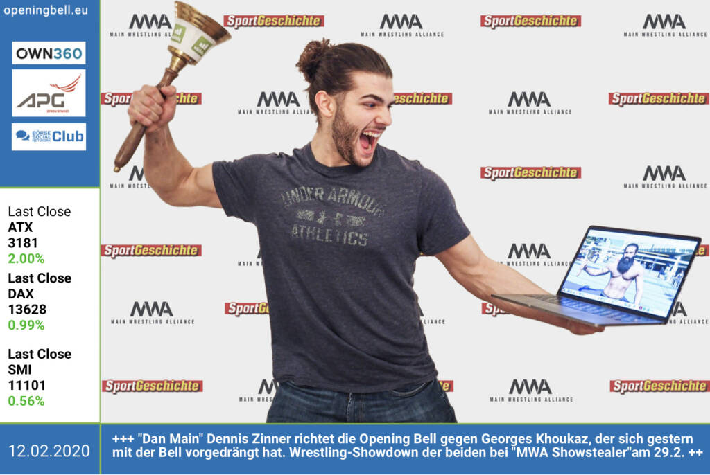11.2.: Georges Khoukaz läutet die Opening Bell für Dienstag. Der Schauspieler (u.a. "4Blocks") und Wrestler wird am 29.2. bei "MWA Showstealer", dem Auftaktevent der neuen Promotion MWA gegen Veranstalter "Dan Main" Dennis Zinner antreten. Tickets unter: https://www.oeticket.com/eventseries/mwa-main-wrestling...