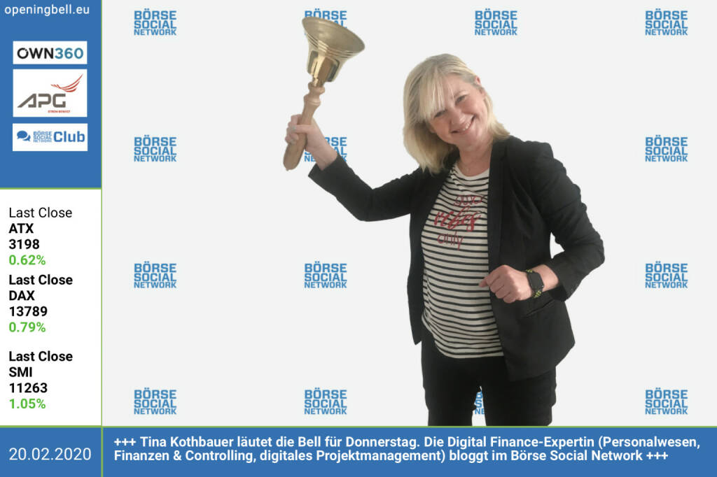 20.2.: Tina Kothbauer läutet die Opening Bell für Donnerstag. Die Digital Finance-Expertin (Personalwesen, Finanzen & Controlling, digitales Projektmanagement) bloggt im Börse Social Network https://christian-drastil.com/blog/tina.kothbauer