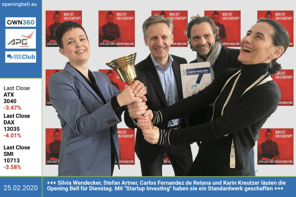 25.2.: Silvia Wendecker, Stefan Artner, Carlos Fernandez de Retana und Karin Kreutzer läuten die Opening Bell für Dienstag. Mit "Startup Investing" haben sie ein Standardwerk geschaffen https://www.lindeverlag.at/buch/startup-investing-18355 . Ein Kapitel bei uns auch unter http://www.boerse-social.com/podcasts