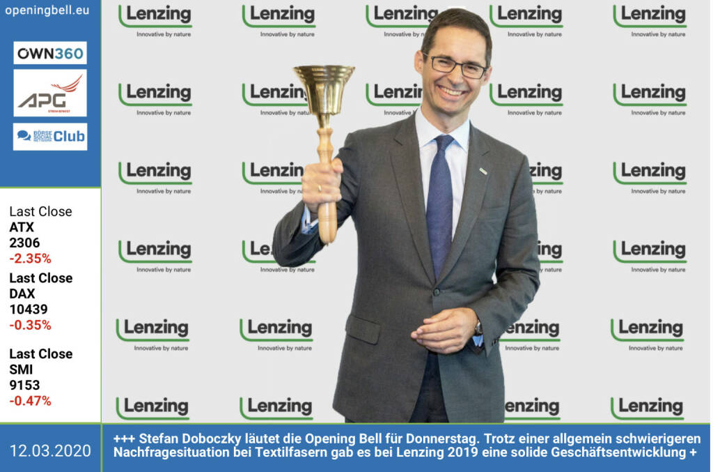 12.3.: Stefan Doboczky läutet die Opening Bell für Donnerstag. Trotz einer allgemein schwierigeren Nachfragesituation bei Textilfasern gab es bei Lenzing 2019 eine solide Geschäftsentwicklung, so der CEO http://www.lenzing.com
