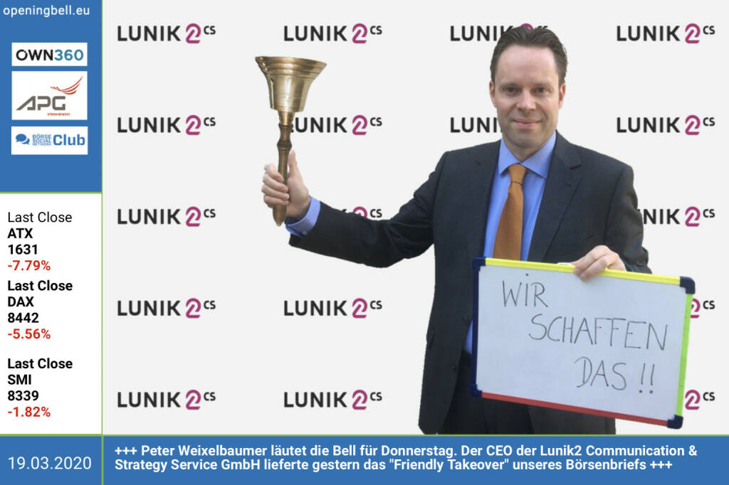 19.3.: Peter Weixelbaumer läutet die Opening Bell für Donnerstag. Der CEO der Lunik2 Communication & Strategy Service GmbH lieferte gestern das "Friendly Takeover" unseres Börsenbriefs https://boerse-social.com/2020/03/18/friendly_takeover_4...