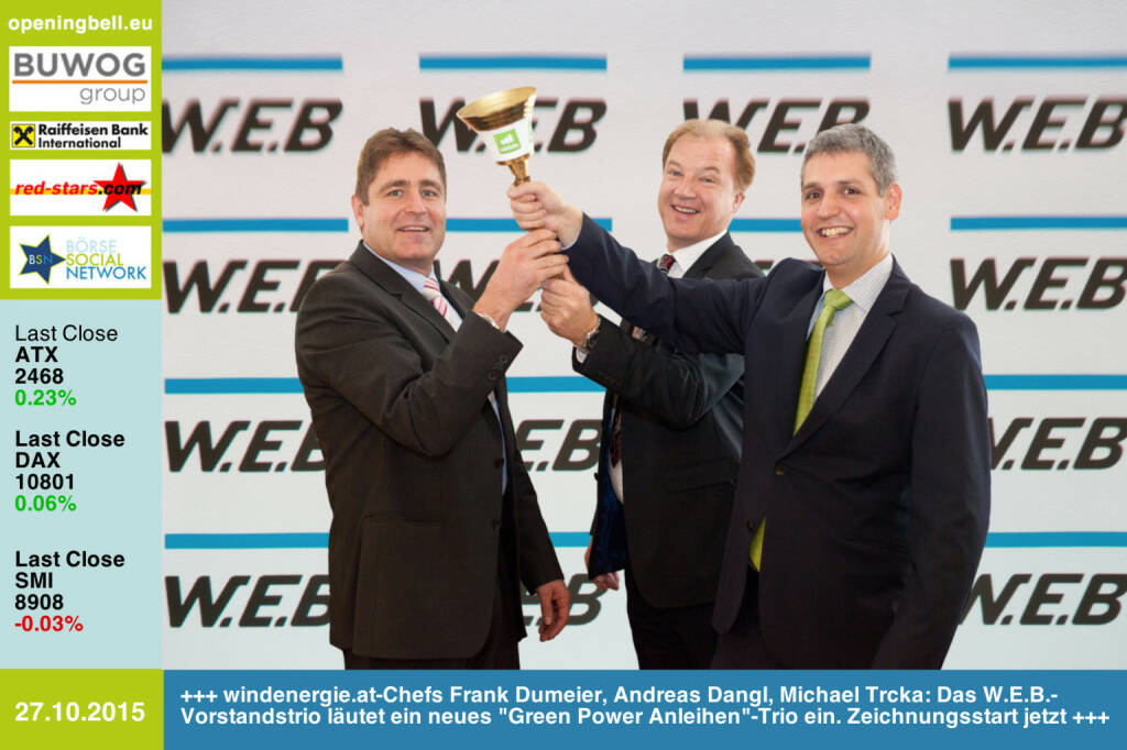 #openingbell am 27.10: windenergie.at-Chefs Frank Dumeier, Andreas Dangl, Michael Trcka: Das W.E.B.-Vorstandstrio läutet ein neues "Green Power Anleihen"-Trio ein. Zeichnungsstart jetzt http://www.openingbell.eu