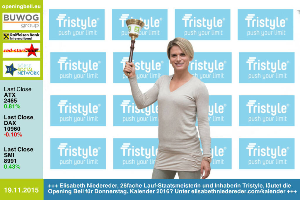 #openingbell am 19.11.: Elisabeth Niedereder, 26fache Lauf-Staatsmeisterin und Inhaberin Tristyle, läutet die Opening Bell für Donnerstag. Kalender 2016? Zu bestellen unter http://www.elisabethniedereder.com/kalender http://www.tristyle.at http://www.openingbell.eu