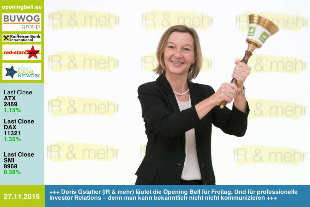 #openingbell am 27.11.: Doris Gstatter (IR & mehr) läutet die Opening Bell für Freitag. Und für professionelle Investor Relations – denn man kann bekanntlich nicht nicht kommunizieren http://www.gstatter.com http://www.openingbell.eu