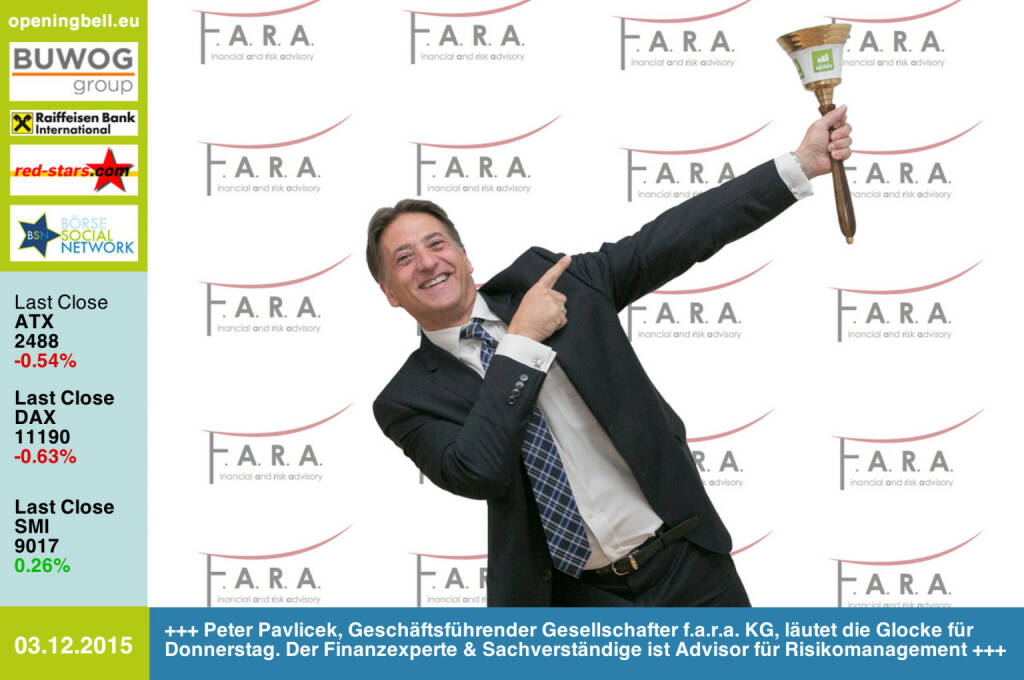 #openingbell am 3.12: Peter Pavlicek, Geschäftsführender Gesellschafter f.a.r.a. KG, läutet die Opening Bell für Donnerstag. Der Finanzexperte und Sachverständige ist Advisor für Risikomanagement http://www.fara.co.at http://www.openingbell.eu
