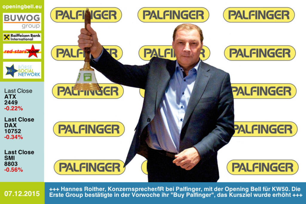 #openingbell am 7.12: Hannes Roither, Konzernsprecher/IR bei Palfinger, mit der Opening Bell für KW50. Die Erste Group bestätigte in der Vorwoche ihr "Buy Palfinger", das Kursziel wurde erhöht http://www.palfinger.com http://www.openingbell.eu