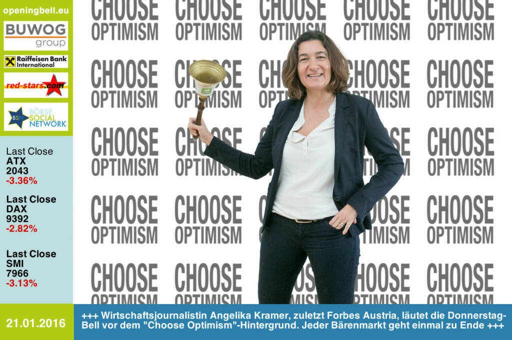#openingbell am 21.1.: Wirtschaftsjournalistin Angelika Kramer, zuletzt Forbes Austria, läutet die Opening Bell für Donnerstag vor dem "Choose Optimism"-Hintergrund. Jeder Bärenmarkt geht einmal zu Ende ...