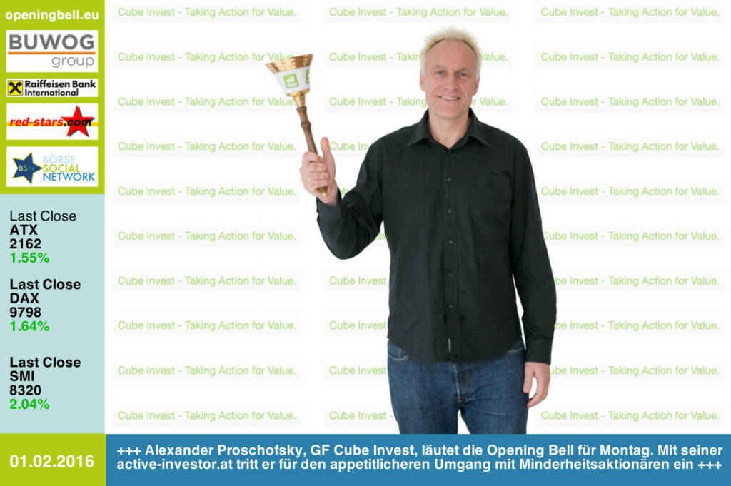 #openingbell am 1.2: Alexander Proschofsky, GF Cube Invest, läutet die Opening Bell für Montag. Mit seiner active-investor.at tritt er für einen appetitlicheren Umgang mit Minderheitsaktionären ein http://www.active-investor.at http://www.openingbell.eu
