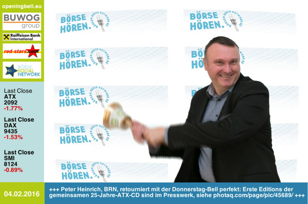 #openingbell am 4.2: Peter Heinrich, BRN, retourniert mit der Donnerstag-Opening Bell perfekt: Erste Editions der gemeinsamen 25-Jahre- ATX-CD sind im Presswerk, siehe photaq.com/page/pic/45689/ http://www.boersenradio.at http://www.openingbell.eu