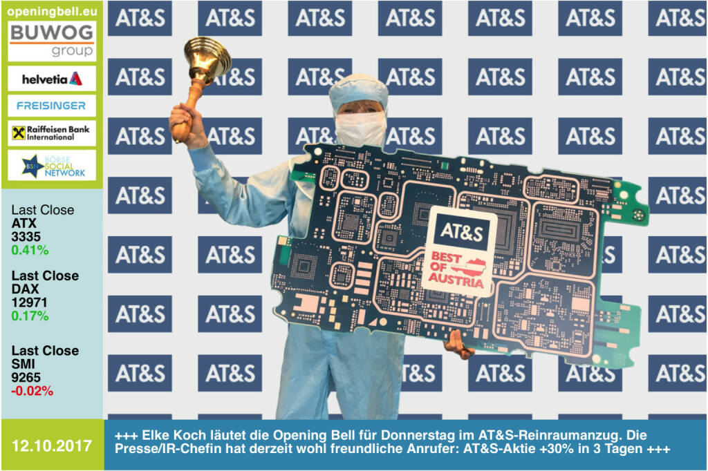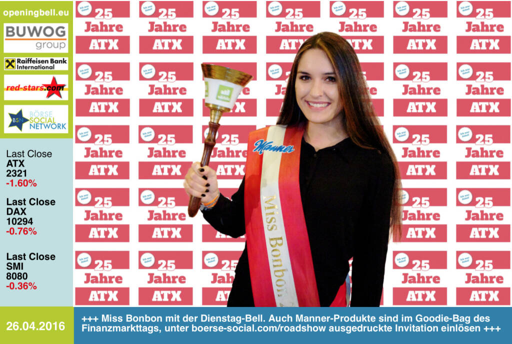 2.5.: Stefanie Huber läutet die Opening Bell für Donnerstag und damit für den Mai. Die Tochter von CEO Ernst Huber ist bei der Direktbank http://www.dad.at für Marketing und Partnergeschäft zuständig https://www.facebook.com/groups/GeldanlageNetwork