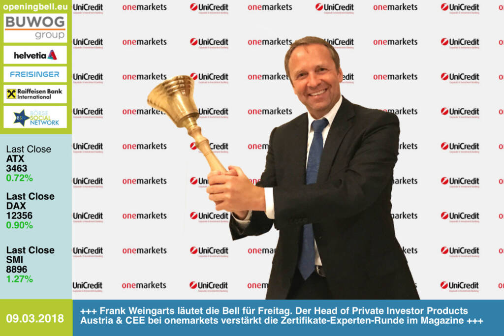 25.4: Frank Weingarts läutet die Opening Bell für Donnerstag. In 14 Tagen findet der Zertifikate Award Austria statt, der UniCredit-Mann begrüsst erstmals als Vorsitzender des ZFA-Vorstands http://www.zertifikateforum.at https://www.onemarkets.at/de.html https://www.facebook.com/groups/GeldanlageNetwork