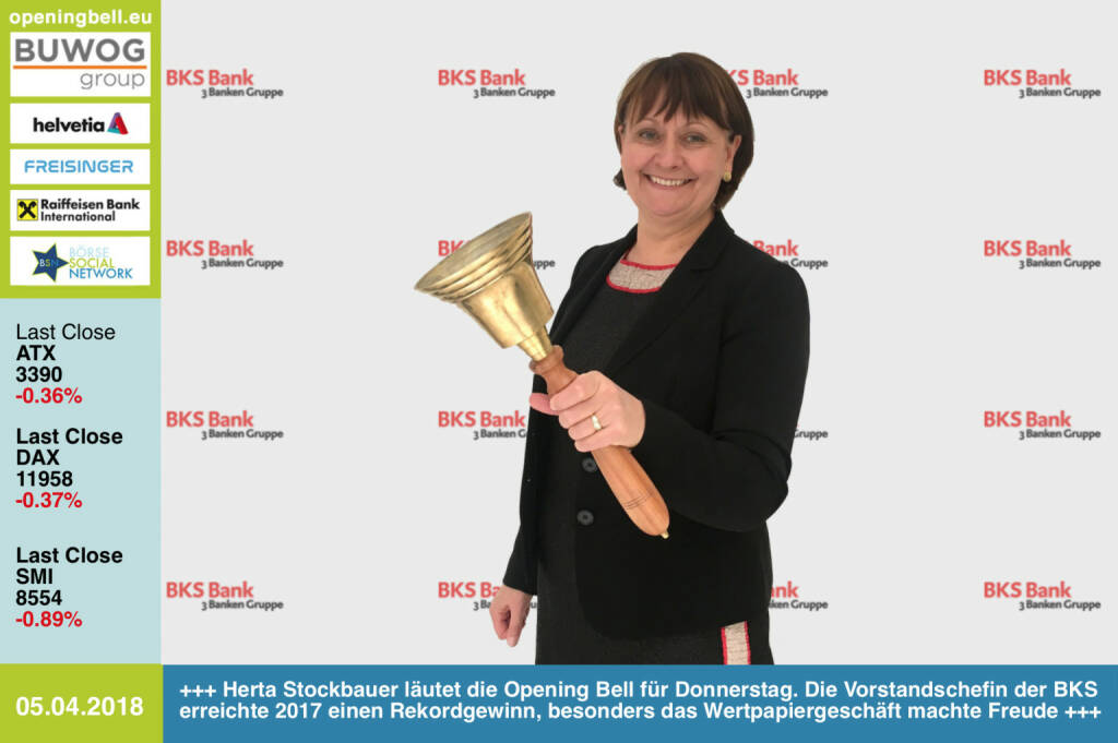 28.5.: Herta Stockbauer läutet die Opening Bell für Dienstag. Als CEO der BKS ist sie heute Host und Startspeakerin der Börse Social Network Roadshow #77 in Wien mit 6 Präsentatoren http://www.bks.at http://www.boerse-social.com/roadshow (Anmeldung geschlossen)