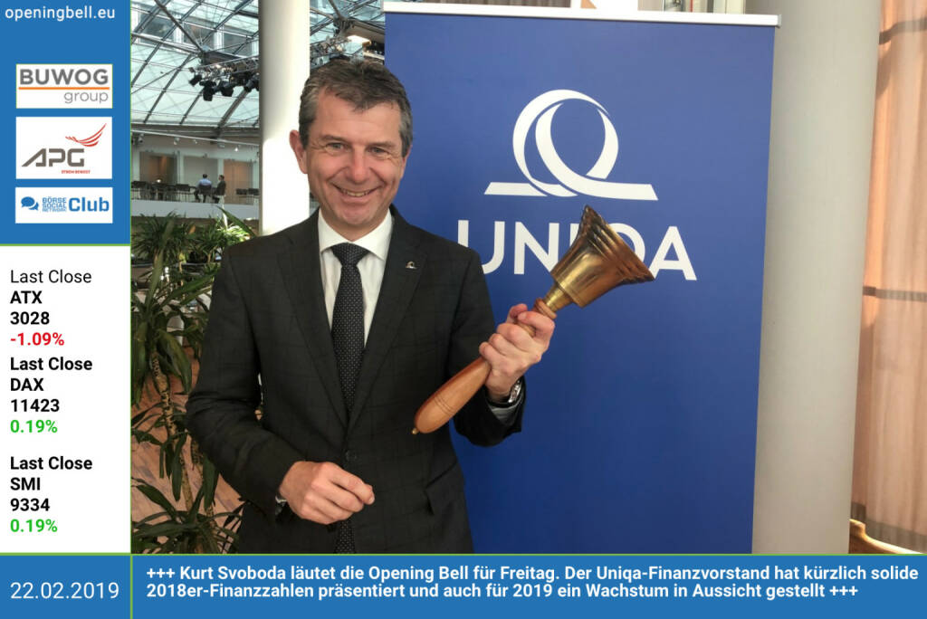 22.2.: Kurt Svoboda läutet die Opening Bell für Freitag. Der Uniqa-Finanzvorstand hat kürzlich solide 2018er-Finanzzahlen präsentiert und auch für 2019 ein Wachstum in Aussicht gestellt http://uniqagroup.com https://www.facebook.com/groups/GeldanlageNetwork