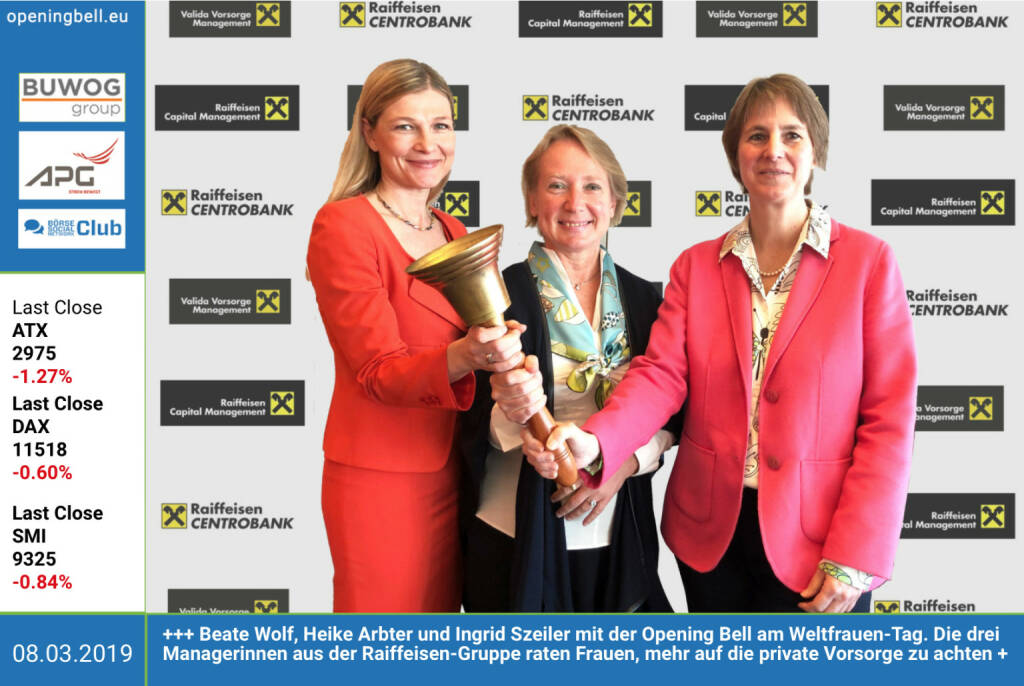 8.3.: Beate Wolf, Heike Arbter und Ingrid Szeiler mit der Opening Bell am Weltfrauen-Tag. Die drei Managerinnen aus der Raiffeisen-Gruppe raten Frauen, mehr auf die private Vorsorge zu achten. https://www.valida.at http://www.rcb.at http://rcm.at https://www.facebook.com/groups/GeldanlageNetwork