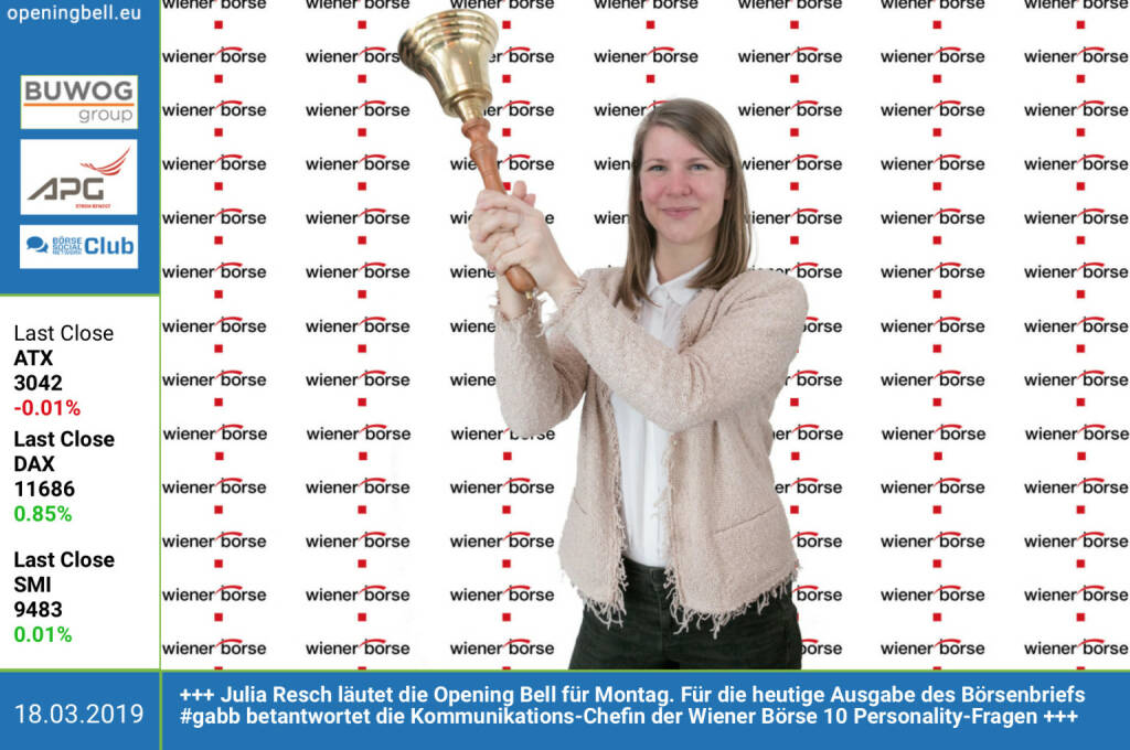 18.3.: Julia Resch läutet die Opening Bell für Montag. Für die heutige Ausgabe des Börsenbriefs http://www.boerse-social.com/gabb betantwortet die Kommunikations-Chefin der Wiener Börse 10 Personality-Fragen a la https://boerse-social.com/search/@title%20personality http://www.wienerborse.at