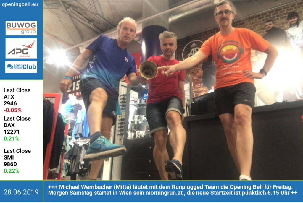 28.6.: Michael Wernbacher (Mitte) läutet mit dem Runplugged Team die Opening Bell für Freitag. Morgen, Samstag, startet in Wien sein Spektakel http://www.morningrun.at , die neue Startzeit ist pünktlich 6.15 Uhr https://www.facebook.com/search/top/?q=sportsblogged http://www.runplugged.com