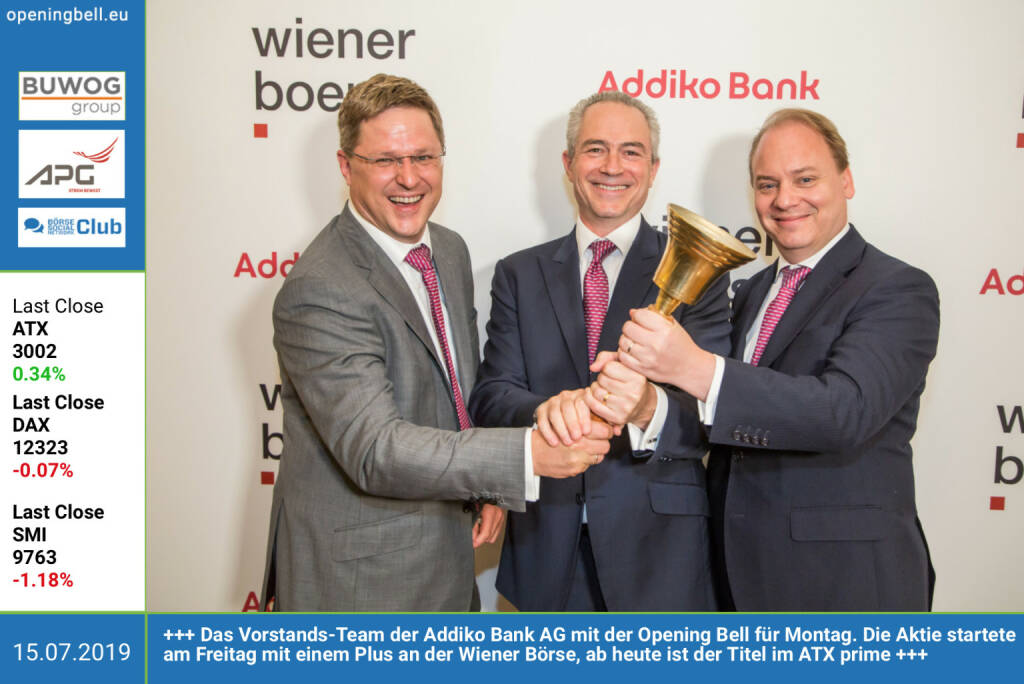 15.7.: Das Vorstands-Team der Addiko Bank mit der Opening Bell für Montag. Die Aktie startete am Freitag, ab heute ist der Titel im ATX prime enthalten. https://www.facebook.com/groups/GeldanlageNetwork