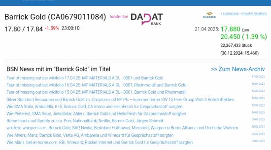 Barrick Gold am 21.4. 1,39%, Volumen 92% normaler Tage