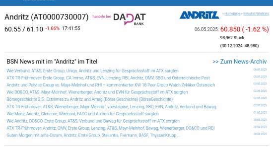 Andritz am 6.5. -1,62%, Volumen 91% normaler Tage