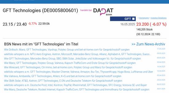 GFT Technologies am 16.5. -6,07%, Volumen 188% normaler Tage