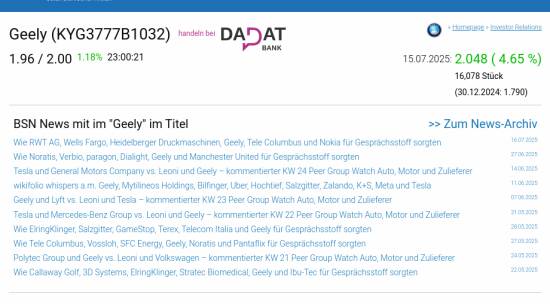 Geely am 15.7. 4,65%, Volumen 17% normaler Tage