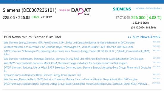 Siemens am 17.7. 4,08%, Volumen 92% normaler Tage