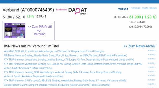 Verbund am 30.9. 1,23%, Volumen 142% normaler Tage